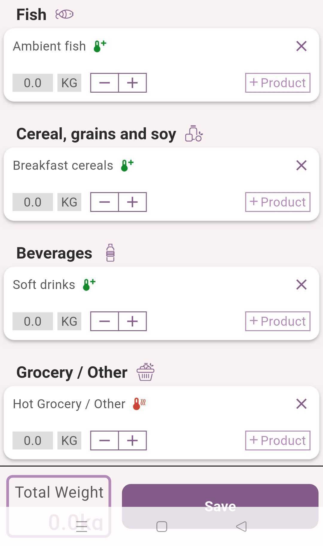 Add and remove new categories of food, units and quantities by clicking on + Add Category button.