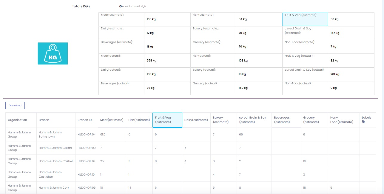For the Date Range chosen the Food Type Impact report displays a Totals grid of the Weight of Estimates and Actuals (when available) broken down by Food Category. (Figures are rounded).