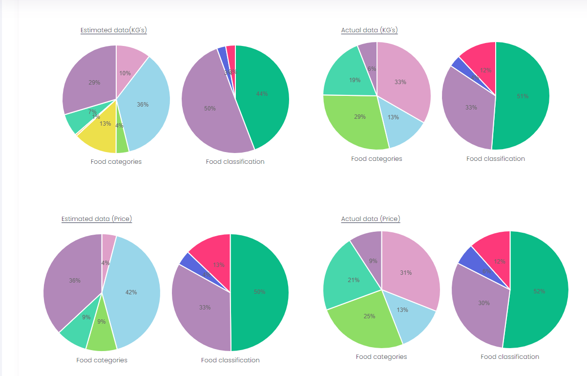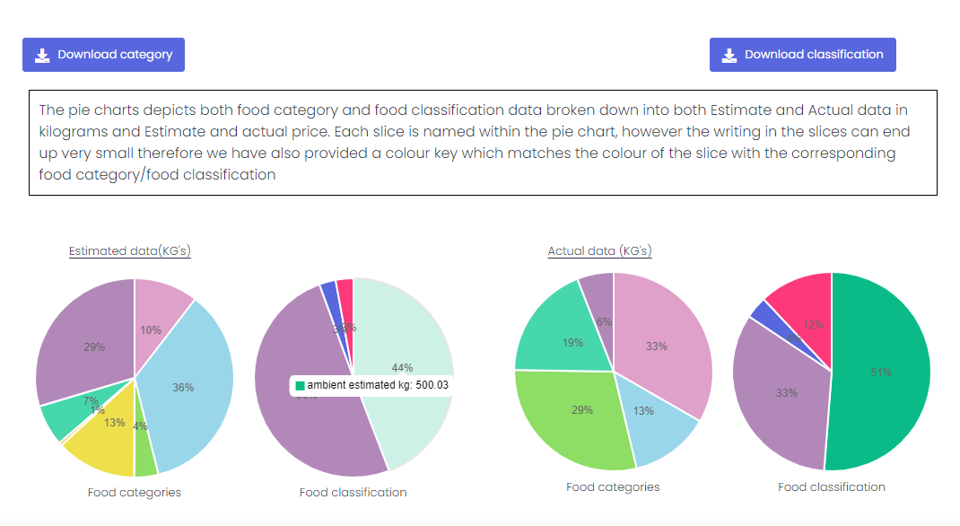 For the Date Range chosen the Food Type Summary report displays a pie chart of the Weight of Estimates and Actuals broken down by Food Category and Food Classification.