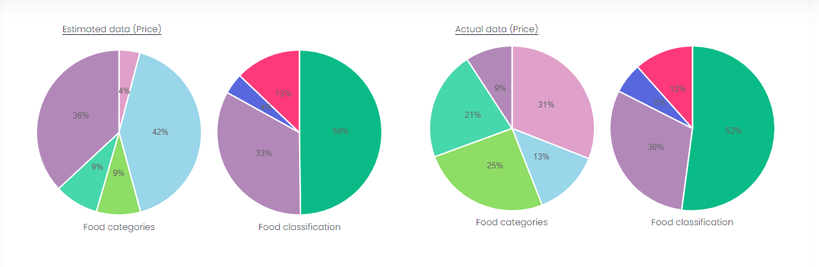 The Food Type Summary report also displays a pie chart of the Price of Estimates and Actuals broken down by Food Category and Food Classification.
