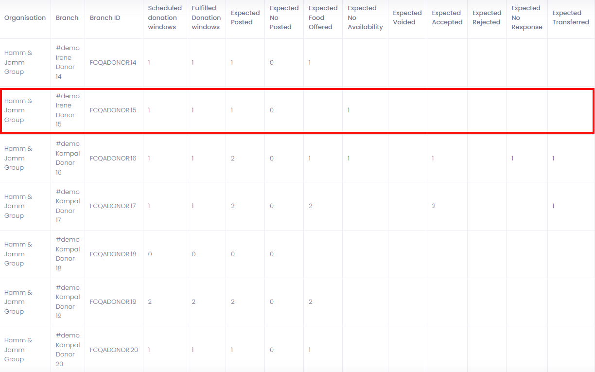 Total Posted=2, Total food Offered=1, Total No Availability = 1, Scheduled donation window = 1, Fulfilled donation window=1, Expected Posted=2, Expected Food Offered = 1, Expected No Availability=1
