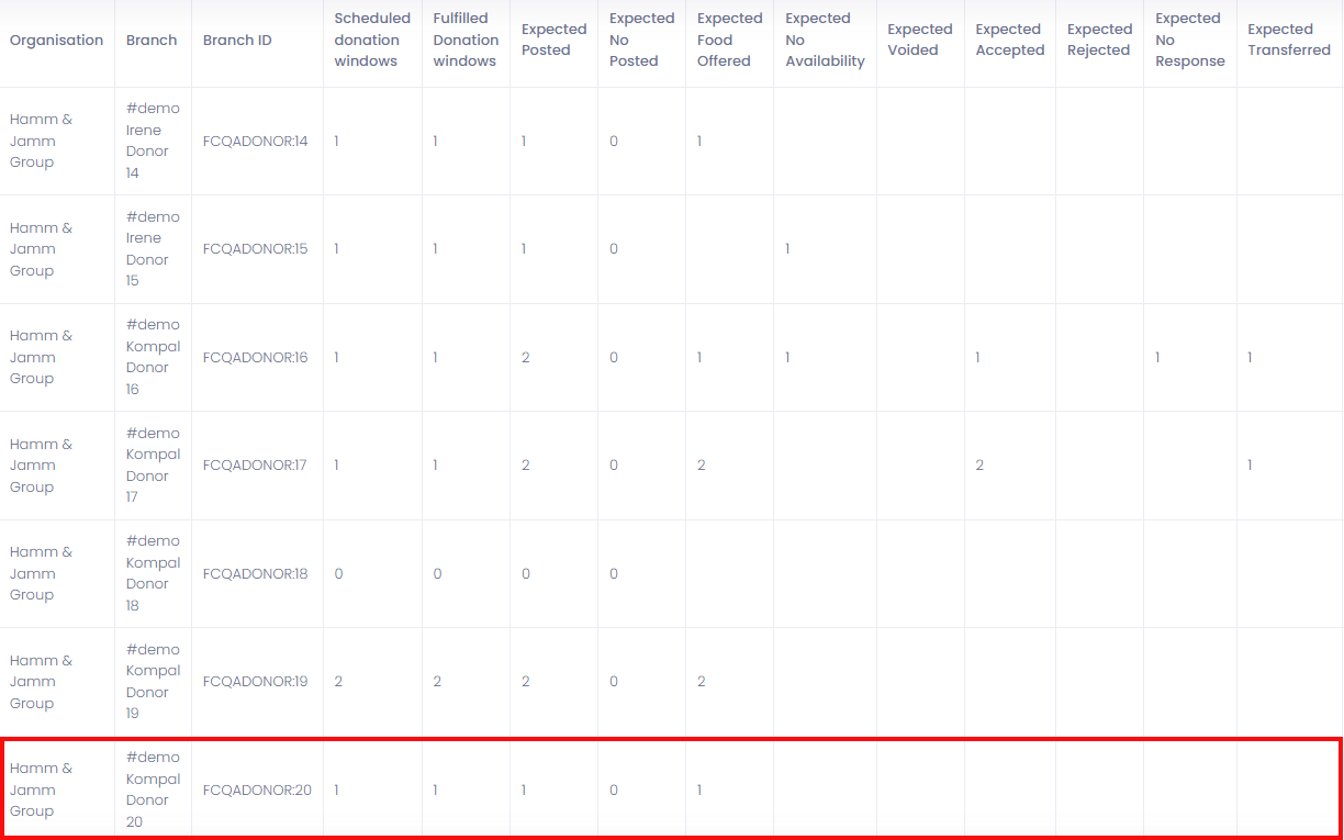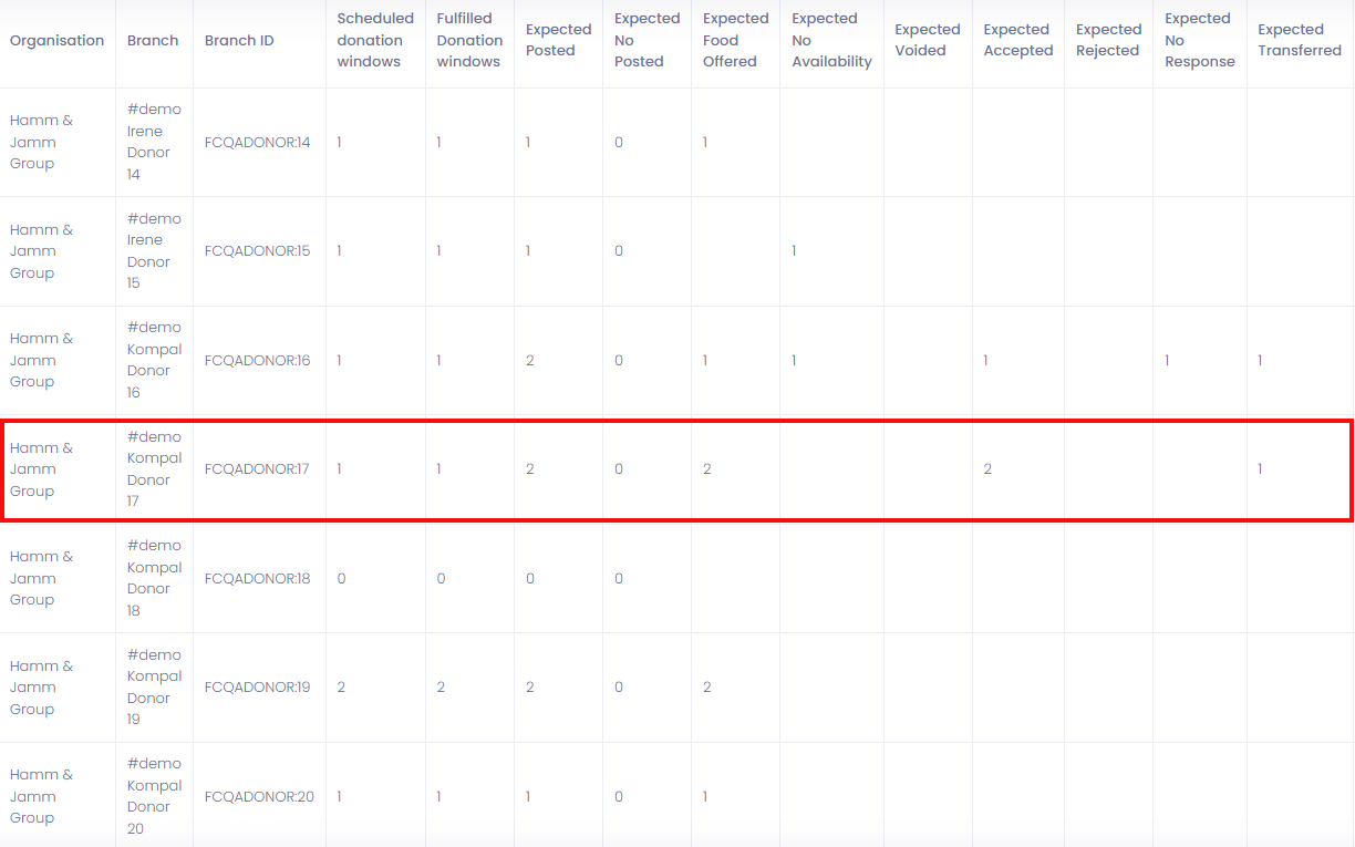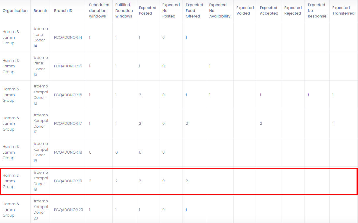 Total Posted=2, Total food offered=2, Total No Availability=0, Scheduled donation window =2, Fulfilled donation window=2, Expected Posted=2, Expected No Availability=0