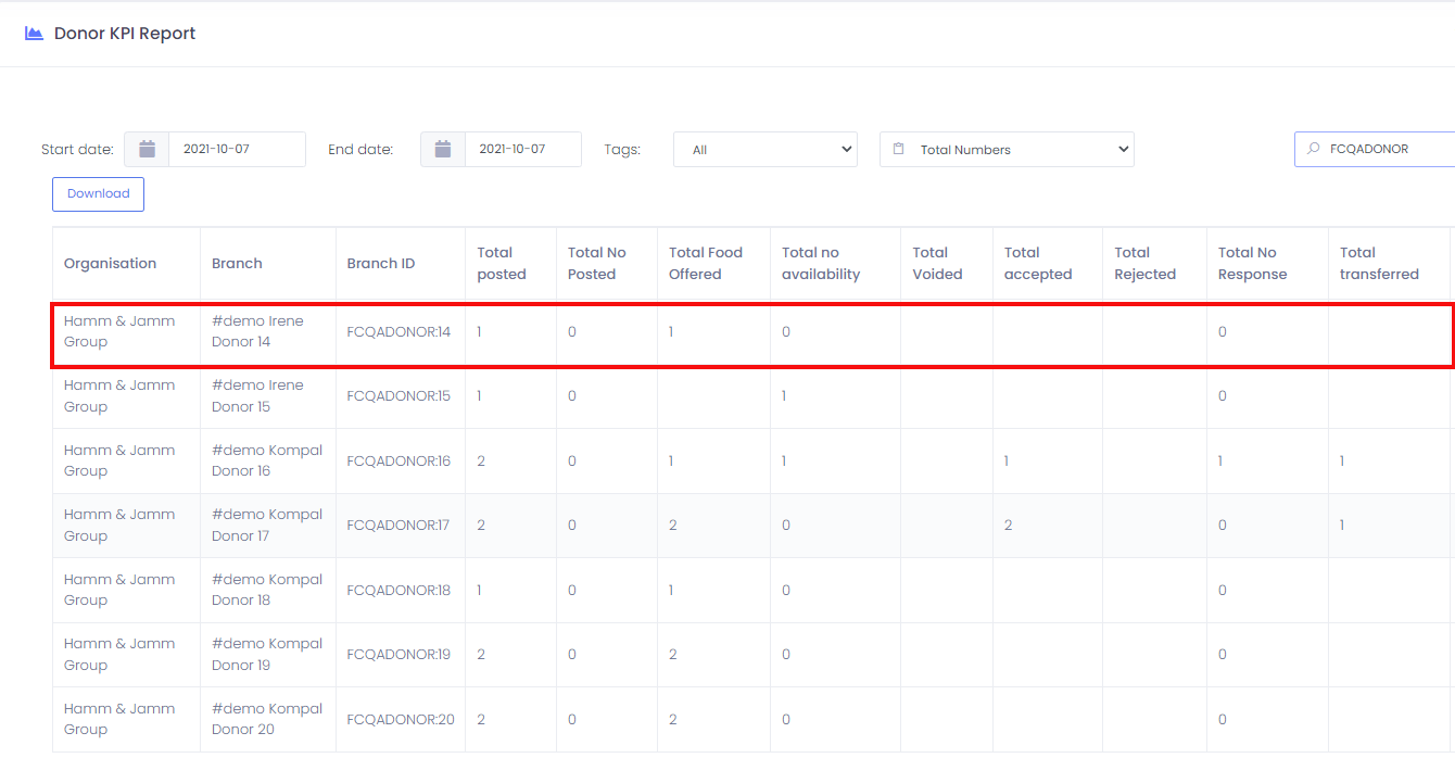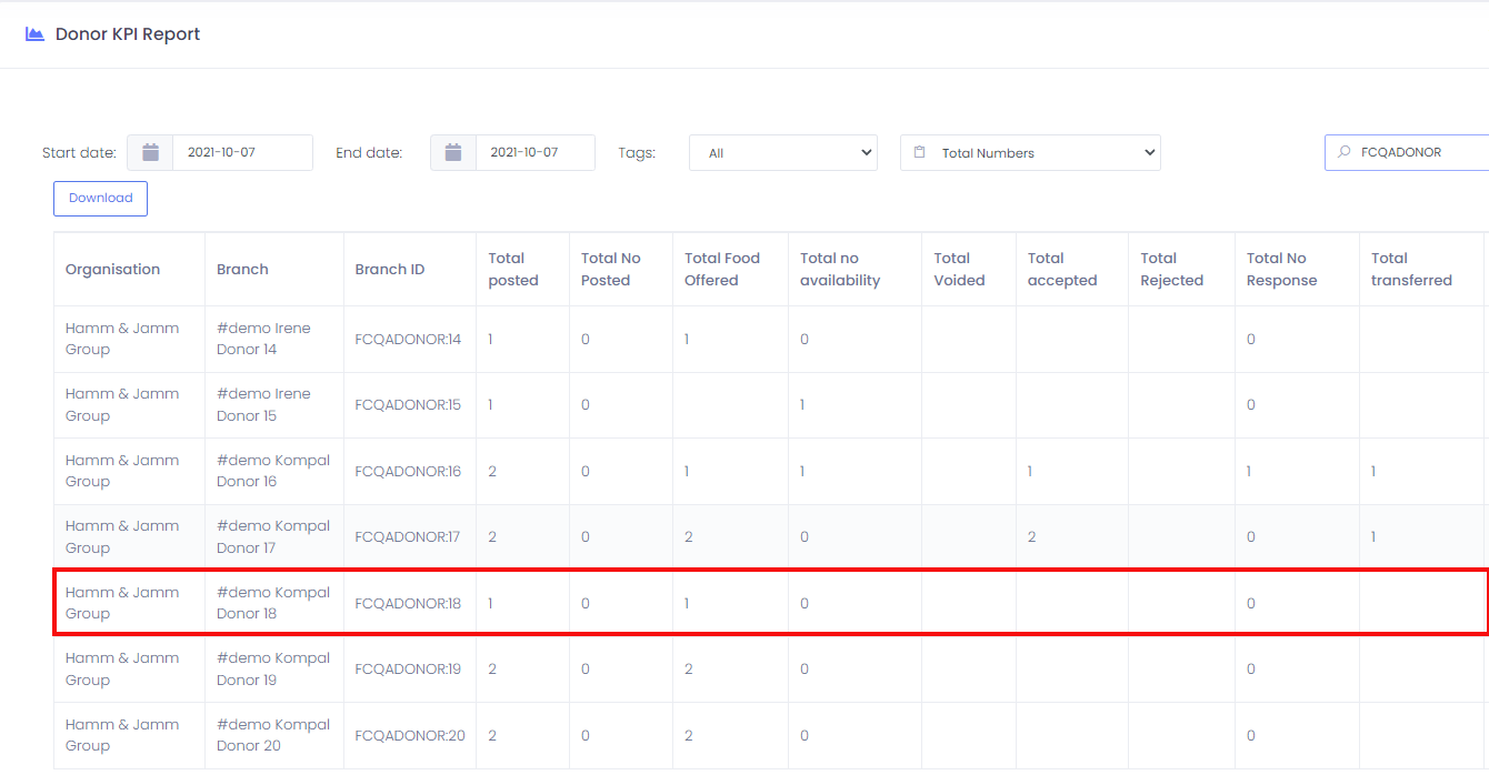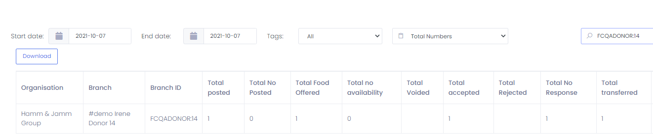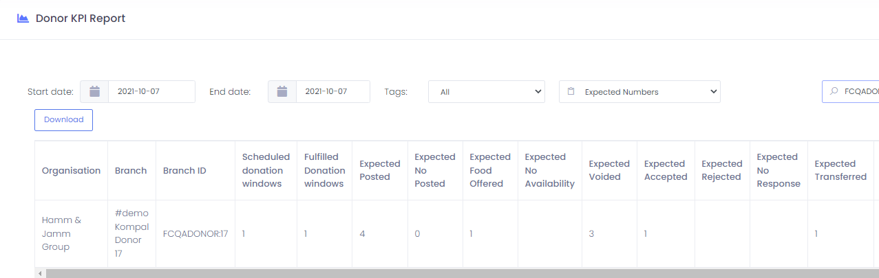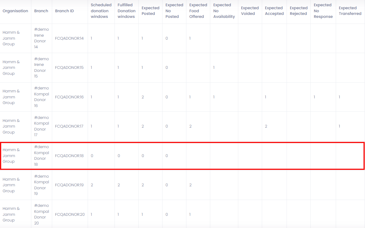 Total Posted = 1, Total Food Offered = 1, Scheduled donation window =0, Fulfilled donation window=0, Expected Posted=0 (Branch ID- FCQADONOR:18*)