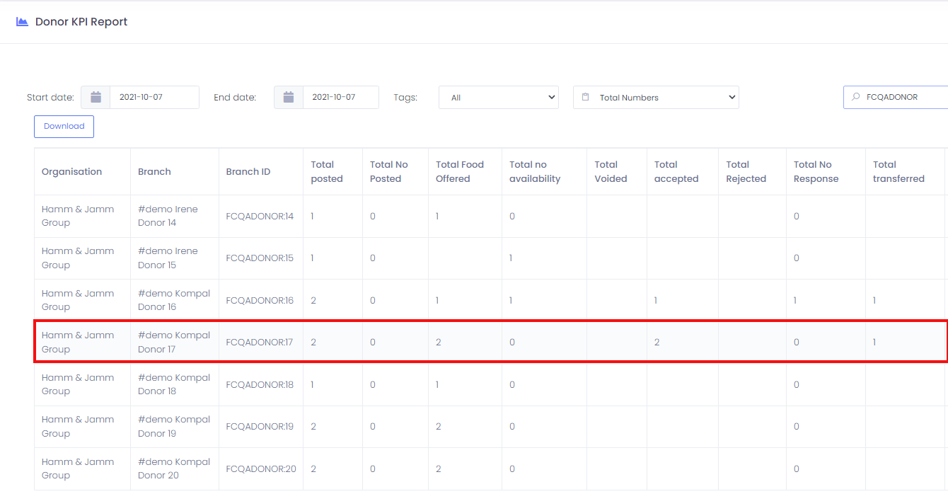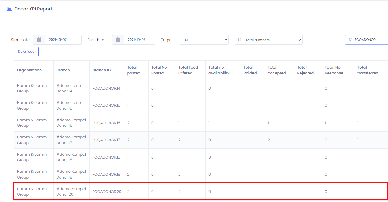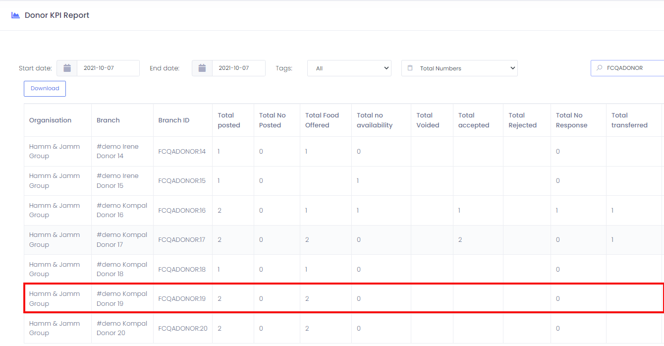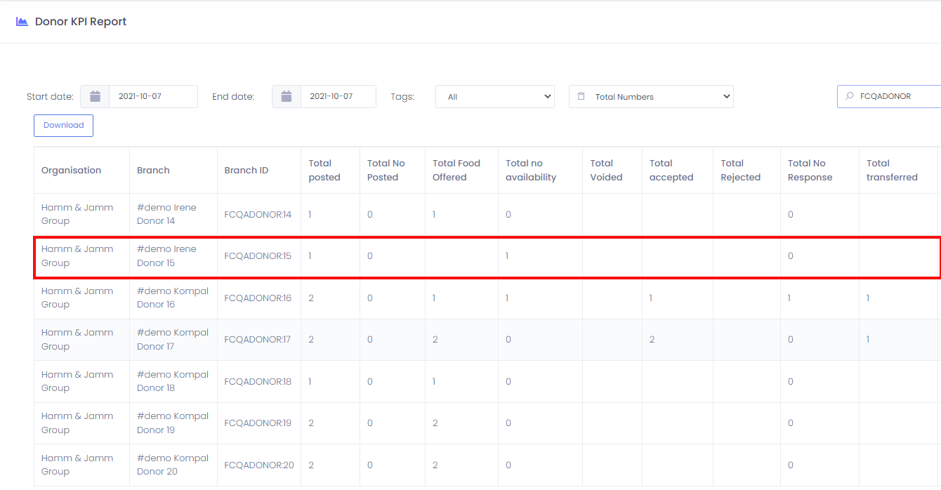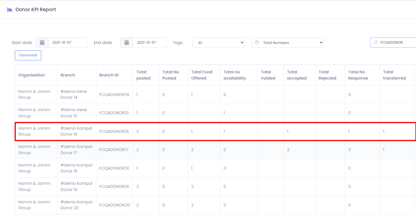 Total Posted = 1, Total Food Offered = 1, Scheduled donation window =0, Fulfilled donation window=0, Expected Posted=0 (Branch ID- FCQADONOR:18*)