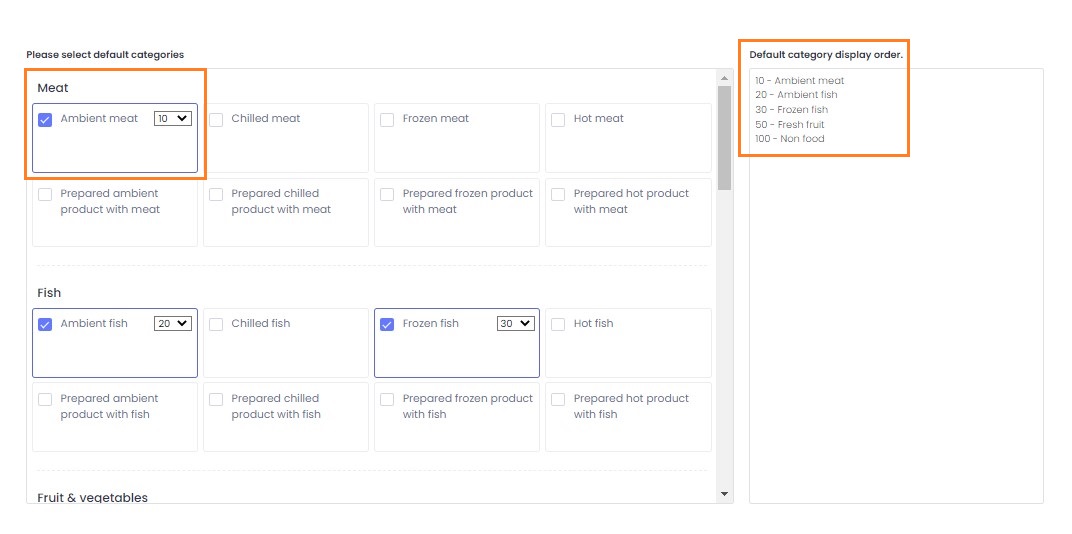 Scroll though the list of Food Categories and tick the ones that you would like to be defaults. You can give the food category a sort number that will determine the order in which they will be presented at Create donation stage. In the example below Ambient Meat has a display number of 10 so it will display ahead of Ambient Fish (20) and Frozen Fish (30). You can see in the 'Default category display order' all of the food categories that you have selected and the order in which they will be presented at Create donation stage.