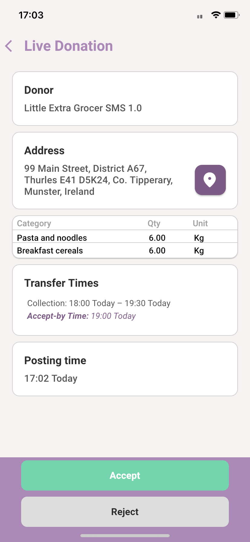 If you click the donation card, you can see more information about the donation. From this page you can also Accept or Reject.