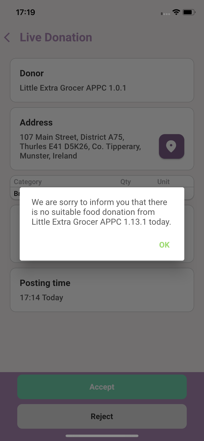 In-App Notification to Primary charity that there is no suitable donation from a donor on your schedule today.