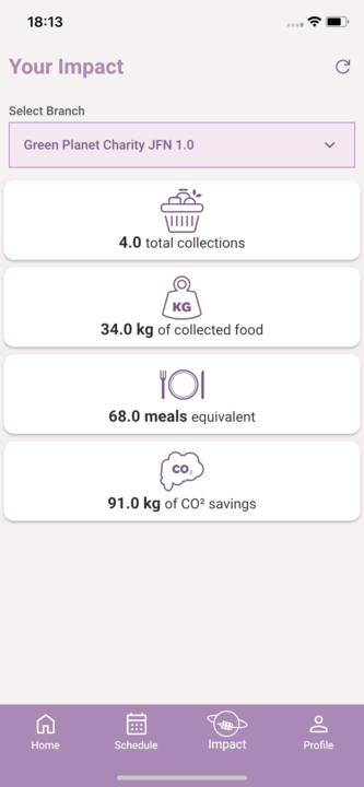 Click the Impact button at the bottom of the screen to view your Total Collections, the Volume of Food that your charity has collected, estimated Meals equivalent and the volume of CO2 your charity has saved as a result of the food the charity has collected and prevented from going to food waste. (This data is based on the original inputs sent by the donor).