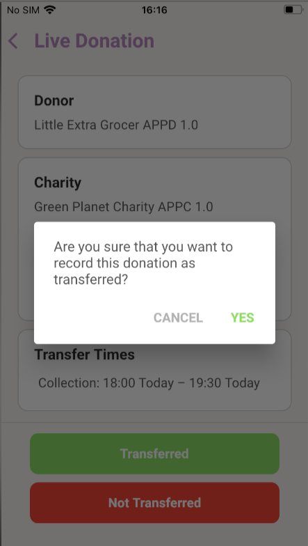 If the donation has been collected/delivered and you click the Transferred button you will get a confirmation message, click Yes.