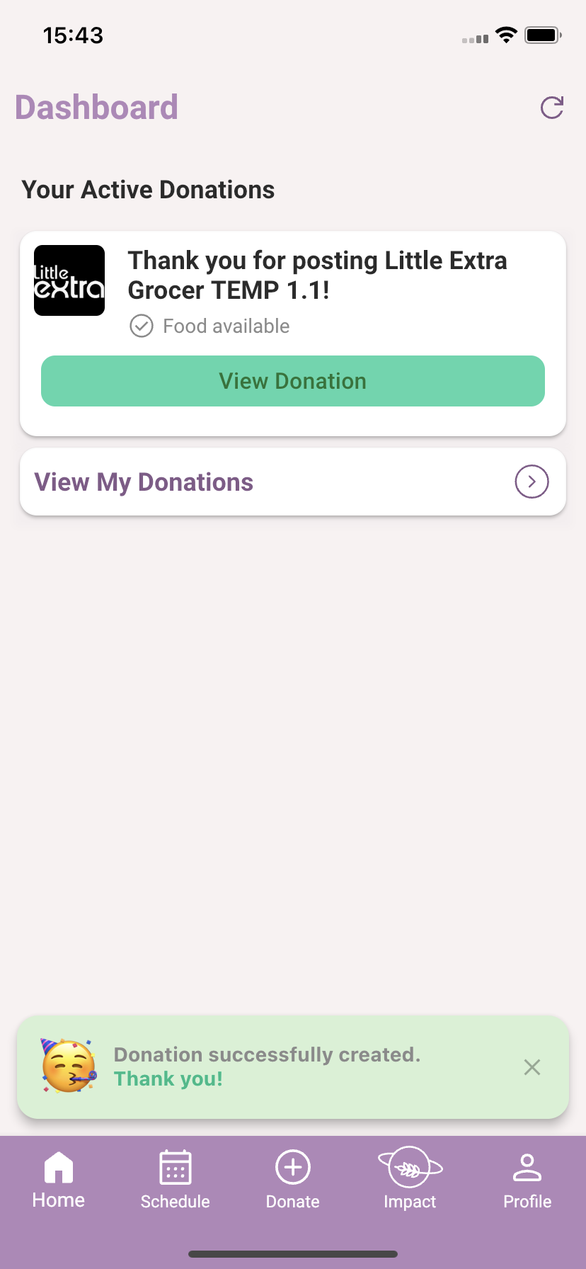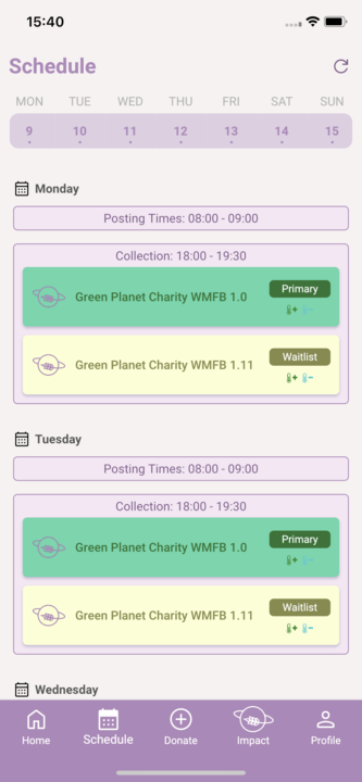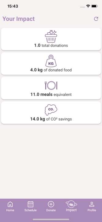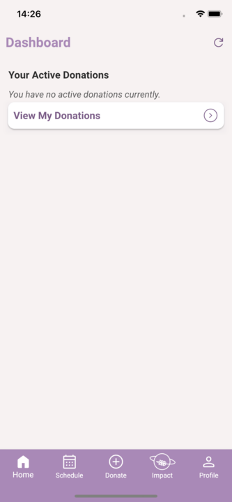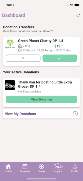 Foodiverse will prompt you if you are scheduled to post a Donation today, see the ‘My Scheduled Donations’ card.