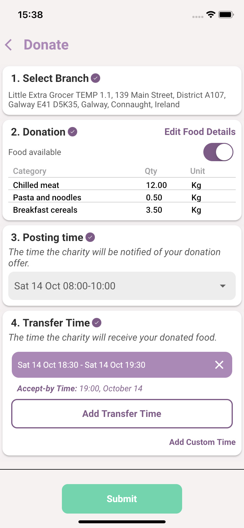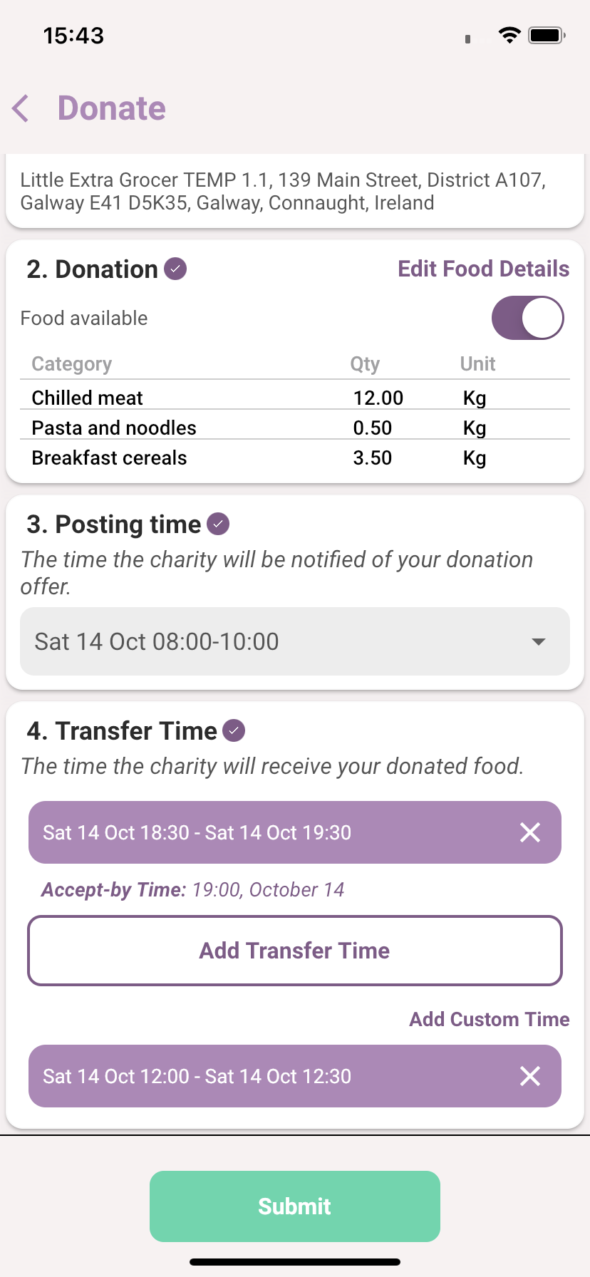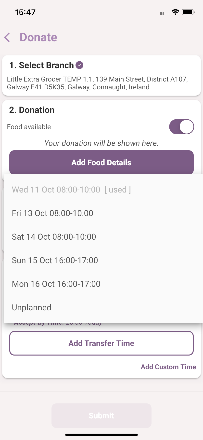 If the Offer time is suitable, go to the next step, otherwise, click the dropdown button to select another Offer Time. Foodiverse will present you with a list of Offer times based on your schedule or you can choose an UnPlanned donation.