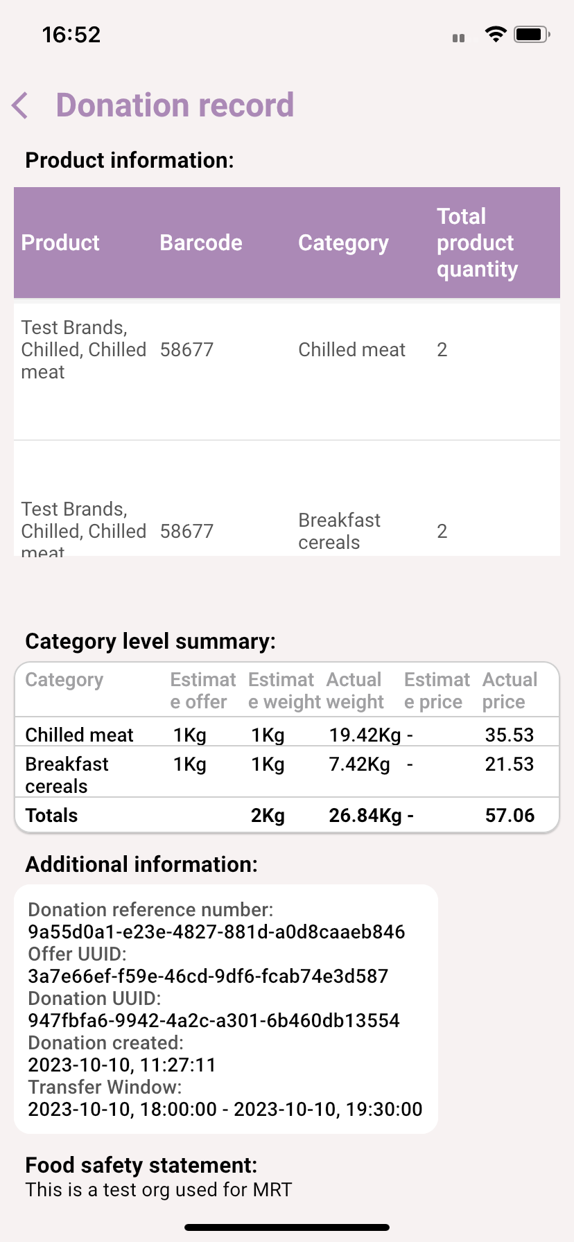 Scroll down to reveal the rest of the Donation Record which list the Category Level Summary, additional information and any Food Safety statement posted by the donor.