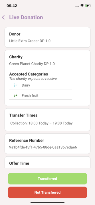 A donor can mark a donation as Transferred (Collected/Delivered). Click the card to see a donation in detail and/or choose whether the donation has been Transferred or Not-Transferred by selecting the corresponding button.
