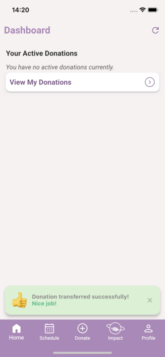 The donation is completed, receive a snackbar saying the ‘Donation transferred successfully. Nice job!’.