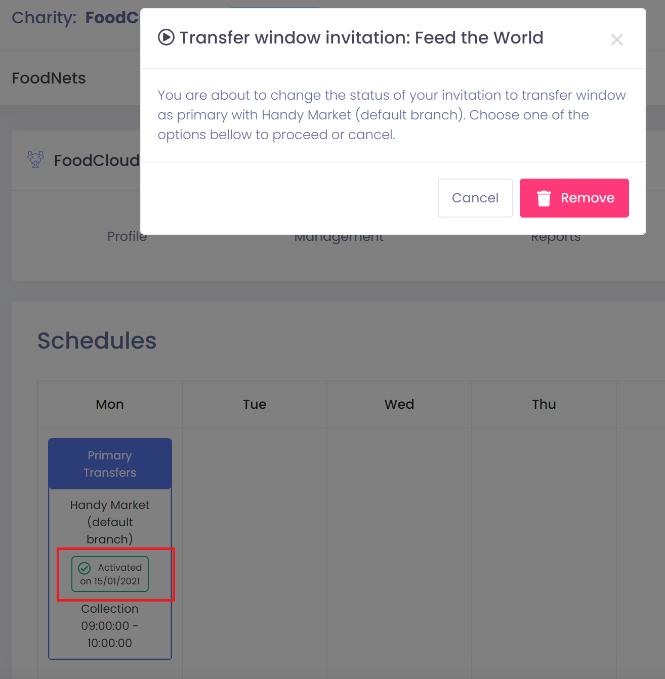 Add a charity in my network to a transfer window