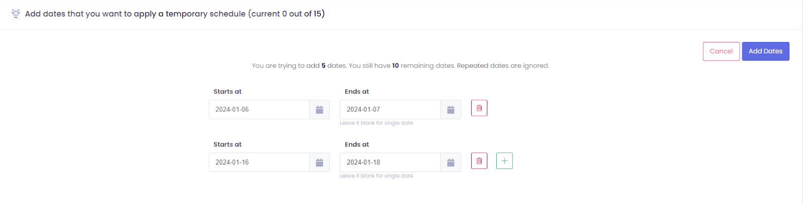 a. If you need more dates you can add non consecutive dates by clicking on the green box