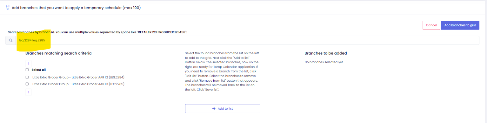 Select the list of branches to be added and click on add to list