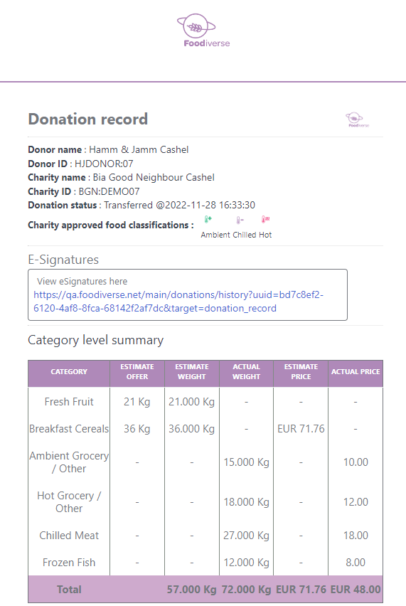If eSignatures are switched On for this donor then a link to the eSignatures will be included